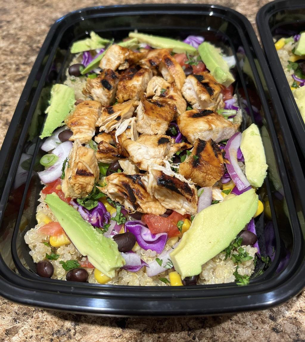 The individual meal to be delivered Thursday, February 19th is a BBQ Ranch Chicken Quinoa Bowl. It includes BBQ chicken, quinoa, black beans, red cabbage, sweet corn, red onion, tomatoes, jalapeno, avocado, cilantro, and scallions. It comes with ranch or blue cheese dressing.