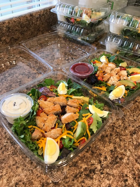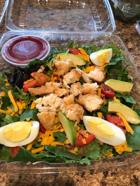 The individual meal to be delivered Wednesday, October 1st is a Cobb Salad with Fried Chicken Tenders. It includes lettuce, chicken, tomato, cheese, bacon, boiled eggs, avocado, and your choice of dressing.
